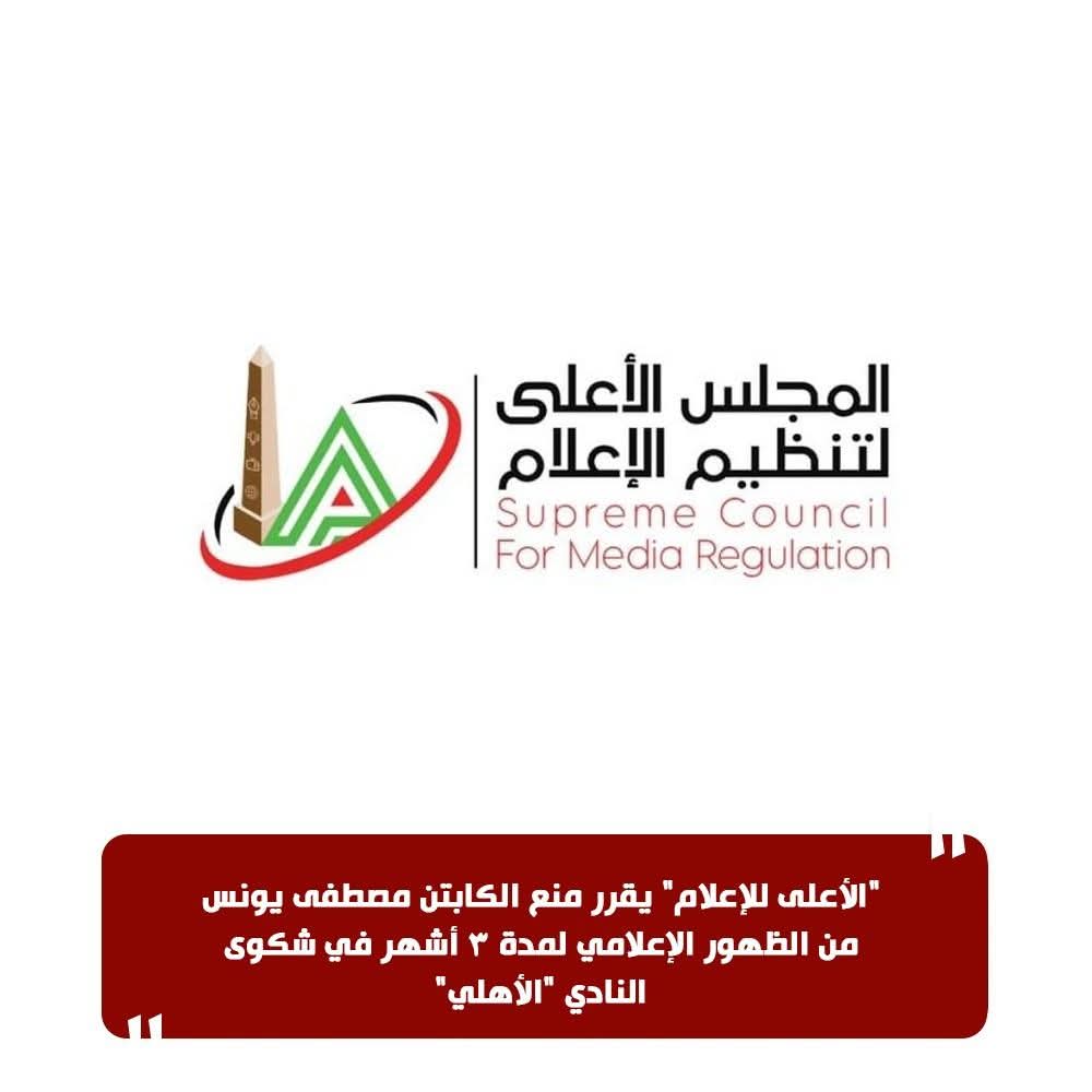 قرر المجلس الأعلى لتنظيم الإعلام، برئاسة المهندس خالد عبدالعزيز، منع الكابتن/ مصطفى يونس من الظهور الإعلامي في كافة الوسائل الإعلامية لمدة ثلاثة أشهر، لمخالفة المعايير والأكواد الصادرة عن المجلس الأعلى لتنظيم الإعلام، وإلزامه بحذف الفيديوهات المسيئة من على قناته على اليوتيوب، وذلك لما ثبت في حقه من الإساءة لرئيس وأعضاء مجلس إدارة النادي «الأهلي».