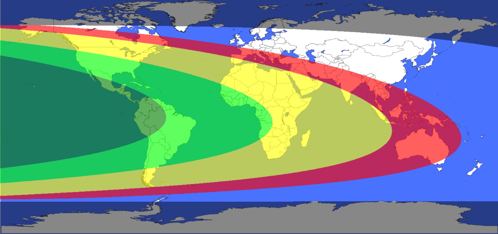 الاحمر: مرئي بالتكديس فقط (لعدم وصول القمر الى حد دانجون للرؤية بالتلسكوب 7 درجات)