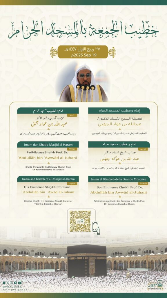أعلنت رئاسة الشؤون الدينية بالمسجد الحرام والمسجد النبوي، عن أسماء خطيبي وأئمة صلاة الجمعة في الحرمين الشريفين ليوم الجمعة الموافق 27 ربيع الأول 1447هـ وذلك ضمن جدولها الدوري لتنظيم الإمامة والخطابة.