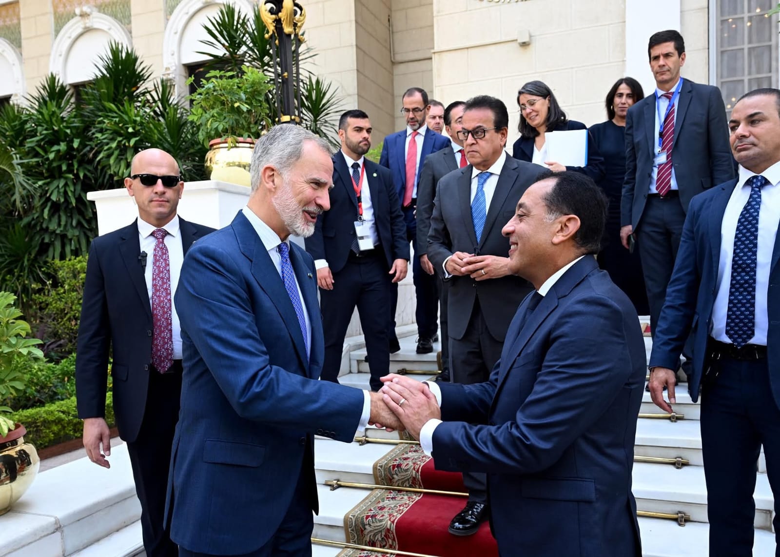 واستهل رئيس الوزراء اللقاء بالترحيب بجلالة الملك/ فيليبي السادس، ملك أسبانيا، بمقر الحكومة بقصر العيني، معرباً عن تشرفه باستقبال جلالة الملك فى هذه الزيارة التاريخية لمصر، والتى تأتي عقب الزيارة الأخيرة للرئيس عبد الفتاح السيسي، رئيس الجمهورية، إلى أسبانيا للمرة الثانية خلال الفترة من 18-20 فبراير الماضي، والتي شهدت التوقيع على إعلان ترفيع العلاقات بين البلدين إلى مستوى الشراكة الاستراتيجية، فضلاً عن التوقيع على عدد من مذكرات التفاهم للتعاون الاقتصادي والتجاري والصناعي والفني والسياحي، وكذا ما يتعلق بمجالي الهجرة، والنقل، وغيرها من المجالات.