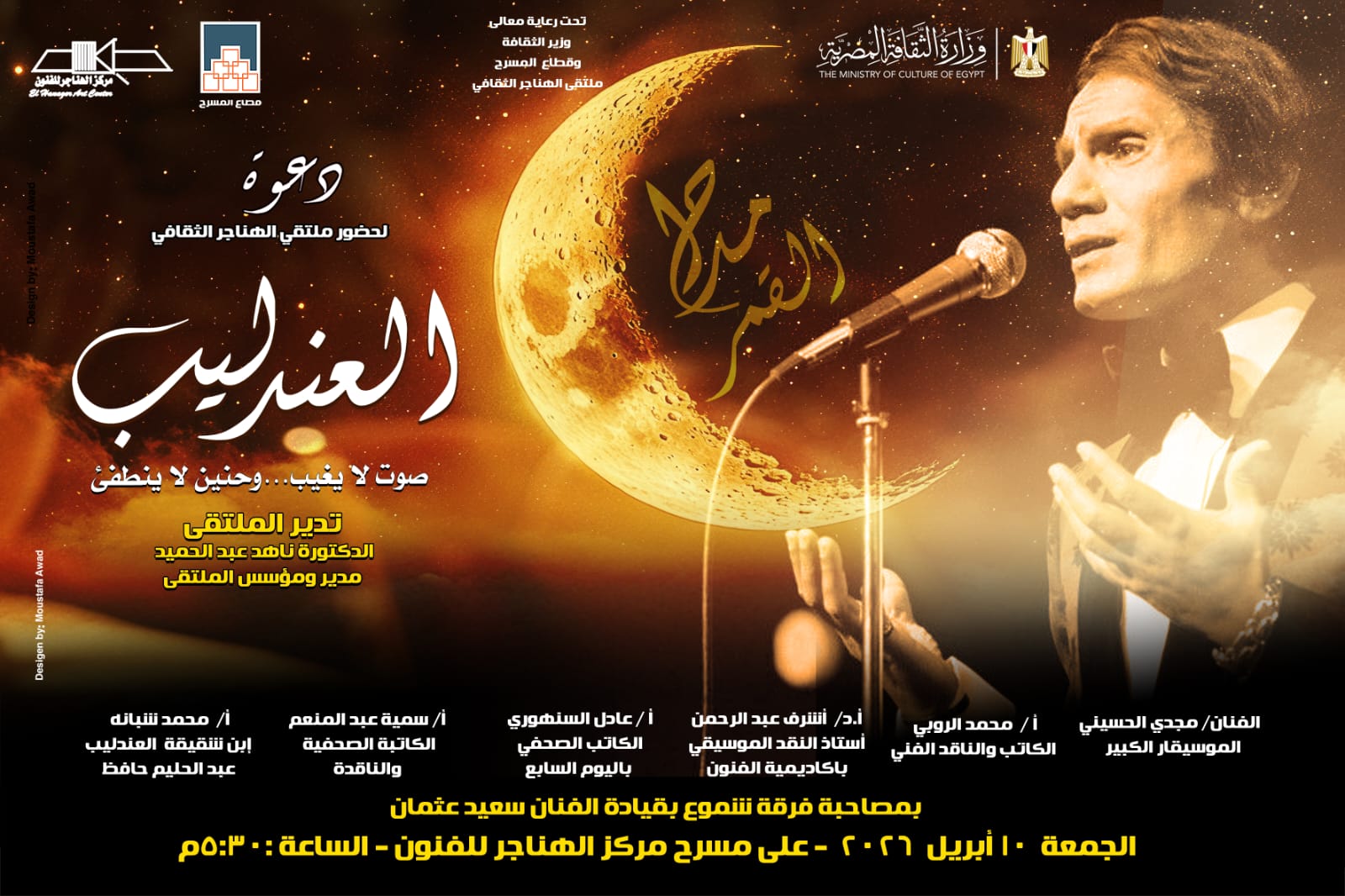ضمن فعاليات وزارة الثقافة، يقيم قطاع المسرح برئاسة المخرج هشام عطوة، ملتقى الهناجر الثقافي بعنوان «العندليب صوت لا يغيب وحنين لا ينطفئ» فى الساعة الخامسة والنصف من مساء غد الجمعة، بمركز الهناجر للفنون برئاسة الفنان شادي سرور .