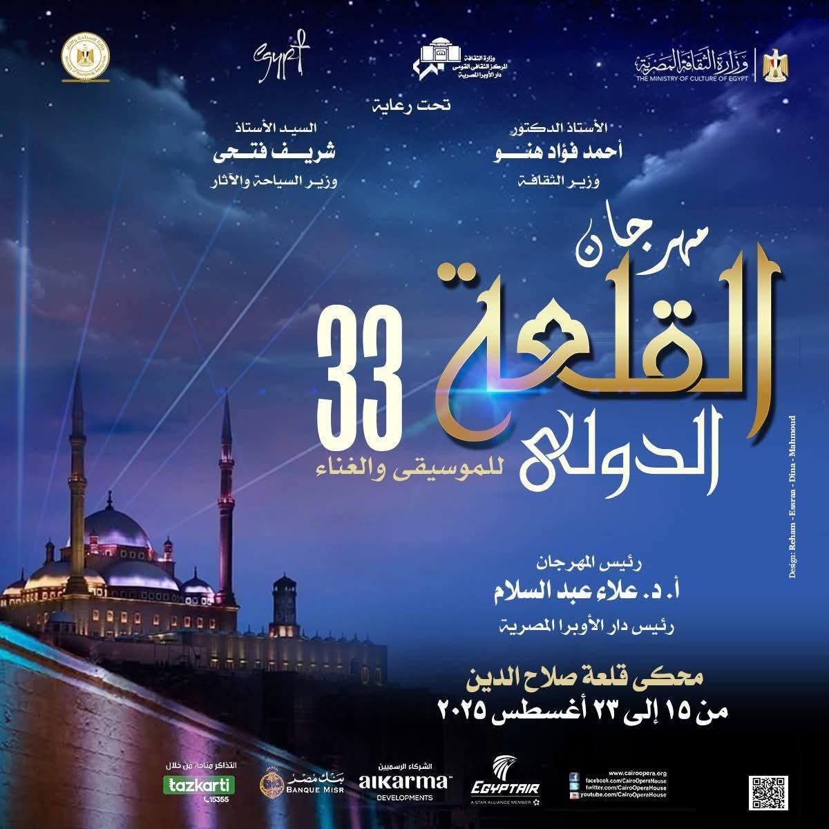 برعاية الدكتور أحمد فؤاد هنو وزير الثقافة والأستاذ شريف فتحى وزير السياحة والآثار تستعد دار الأوبرا المصرية برئاسة الدكتور علاء عبد السلام بالتعاون مع هيئة تنشيط السياحة، لإطلاق فعاليات الدورة 33 من مهرجان القلعة الدولي للموسيقي والغناء والمقام فى الفترة من الجمعة 15 أغسطس حتى السبت 23 أغسطس .