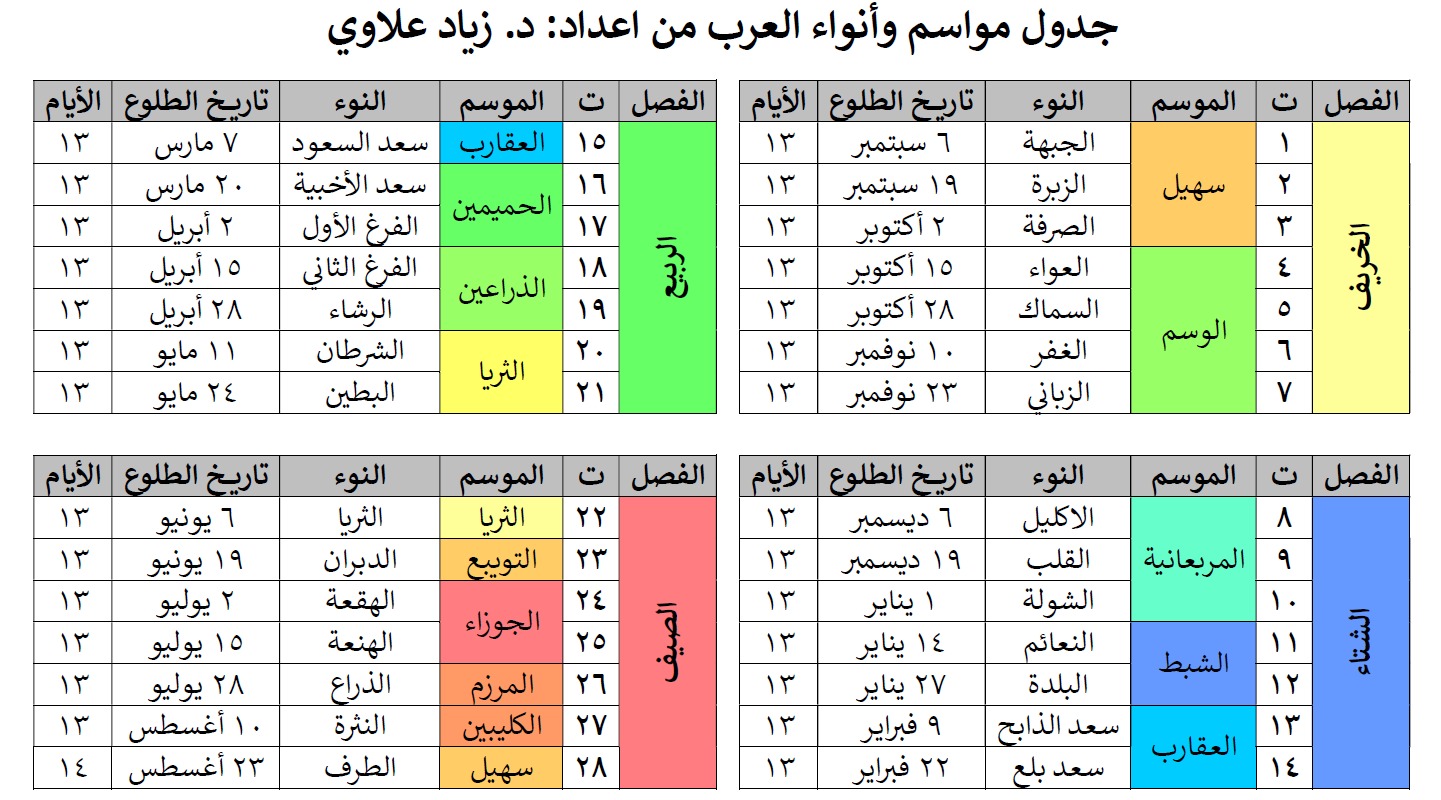 وقد أسفرت هذه الحسابات عن إعداد جدول فلكي دقيق يمكن الاستفادة منه في تحديد بدايات مواقيت الأنواء في مناطق وسط شبه الجزيرة العربية، الأمر الذي يوفر مرجعاً علمياً موثوقاً للباحثين والمهتمين بعلم الفلك والأنواء.