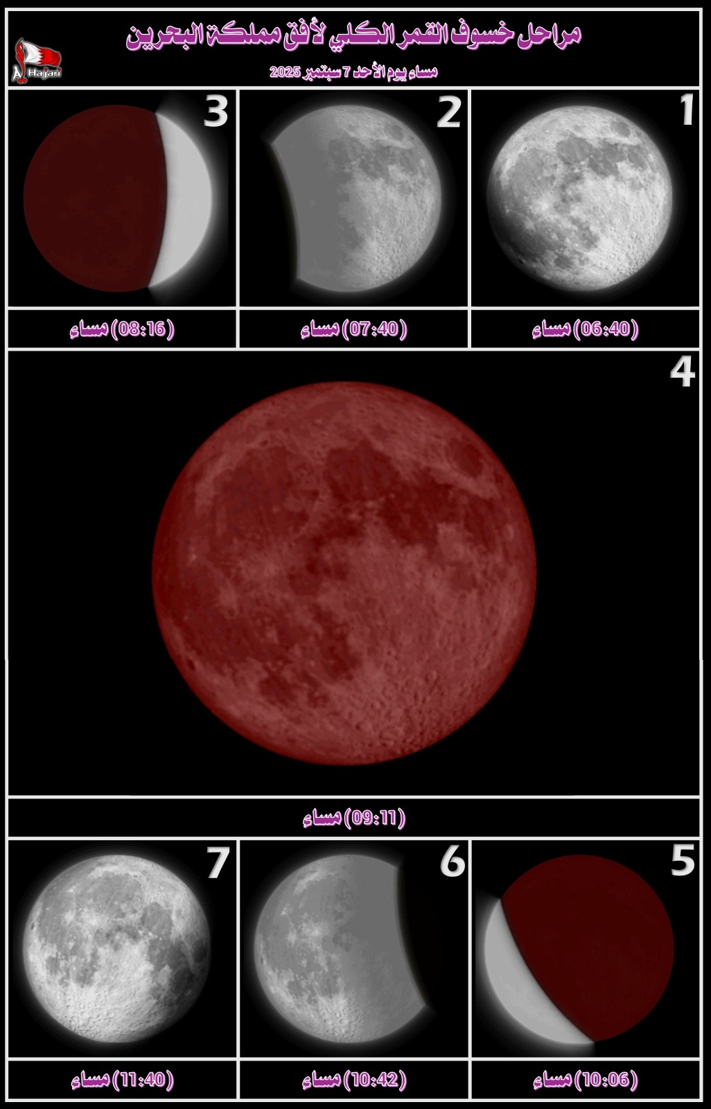 قال الباحث الفلكي علي الحجري أن الخليج ستشهد ظاهرة خسوف كلي للقمر في مساء يوم غدا الأحد 7 سبتمبر 2025 ليكون بدايته المنظور للعين بدخوله في مخروط ظل الأرض في الساعة (07:26) وذروته في الساعة (09:11) وينتهي لمرحلة المنظور في الساعة (10:56) مساء، وأشار إلى إمكانية رؤية القمر المخسوف كذبا قبل هذا الوقت بعد دخول قرص القمر في التدرجات الغامقة لشبه مخروط ظل الأرض بنسبة (56.38%) تقريبا في الساعة (07:06) مساء وخصوصا في وجود الهباء الجوي ويصور واضحا بالكاميرا، ويتأخر في تلاشي مظاهر الخسوف من بعد انتهاء الخسوف المنظور في حوالي الساعة (11:17) مساء.