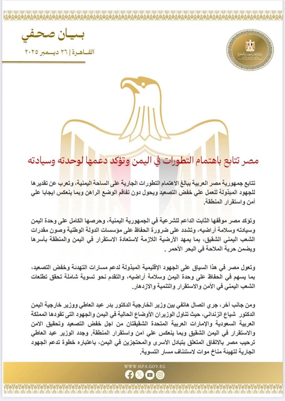 وتؤكد مصر موقفها الثابت الداعم للشرعية في الجمهورية اليمنية، وحرصها الكامل على وحدة اليمن وسيادته وسلامة أراضيه، وتشدد على ضرورة الحفاظ على مؤسسات الدولة الوطنية وصون مقدرات الشعب اليمني الشقيق، بما يمهد الأرضية اللازمة لاستعادة الاستقرار في اليمن والمنطقة بأسرها ويضمن حرية الملاحة في البحر الأحمر .