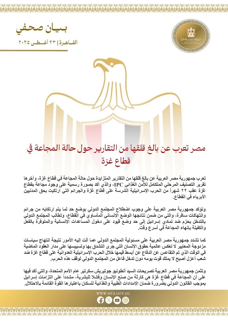 تعرب جمهورية مصر العربية عن بالغ قلقها من التقارير المتزايدة حول حالة المجاعة في قطاع غزة، وآخرها تقرير التصنيف المرحلي المتكامل للأمن الغذائي IPC، والذي أكد بصورة رسمية على وجود مجاعة بقطاع غزة عقب ٢٢ شهراً من الحرب الإسرائيلية الشرسة على قطاع غزة والجرائم التي ارتكبت بحق المدنيين الأبرياء في القطاع.