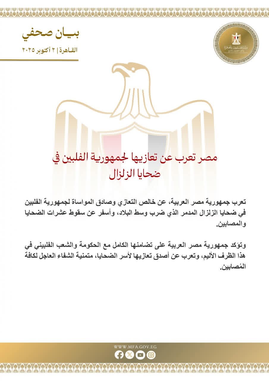 أعربت جمهورية مصر العربية، عن خالص التعازى وصادق المواساة لجمهورية الفلبين فى ضحايا الزلزال المدمر الذى ضرب وسط البلاد، وأسفرعن سقوط عشرات الضحايا والمصابين.