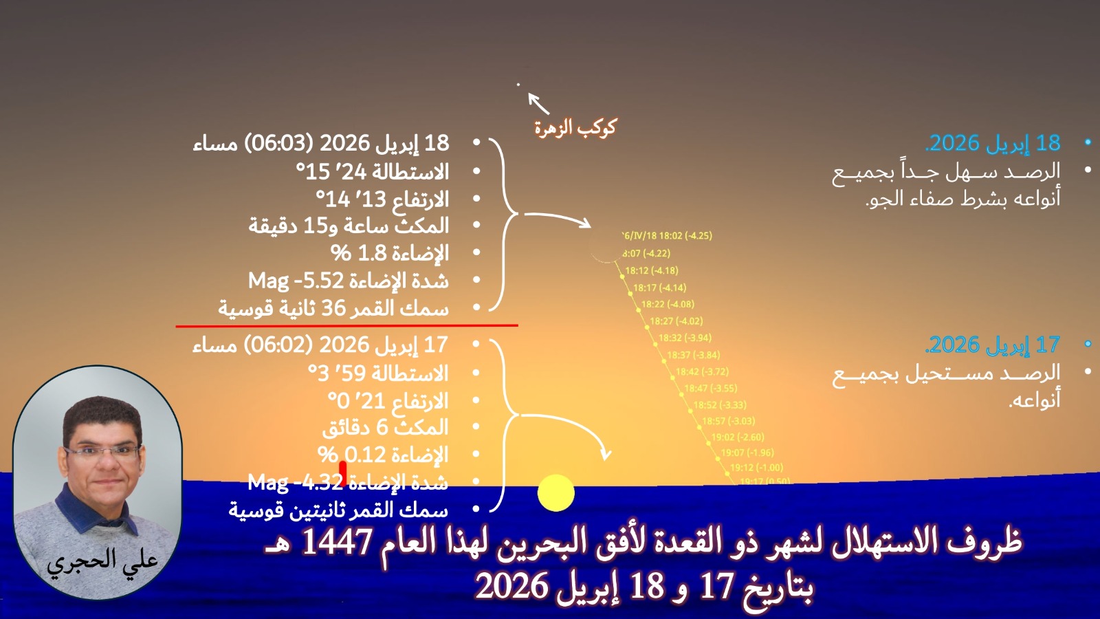 ولفت الحجري أن قمر شهر ذو القعدة سيقترن مع الشمس بمشيئة الله تعالى في مساء الجمعة القادم 17 إبريل الجاري في تمام الساعة (04:31) مساء للحساب السطحي لأفق مملكة البحرين، ليستحيل رصده في جميع الدول الوطن العربي للعين المجردة لسببين بالترتيب وهما قرب اقتران القمر بالشمس قبيل غروبها، وصغر القيم الفلكية للقمر عند أفوله وقربه الشديد من الشمس، بينما سيكون الهلال سهلا في الرصد بعد يوم من اقترانه بالشمس في 18 من إبريل، ليمكث القمر في سماء البحرين لمدة 75 دقيقة، قبل أفوله في تمام الساعة (06:03) مساء، إذ يكون عمر القمر في هذه الفترة 25 ساعة و32 دقيقة، وعلى ارتفاع 14° و13′، وبزاوية الاستطالة 15° و24′ دقيقة، ليعكس بذلك 1.8% من أشعة الشمس على سطح القمر، وبشدة إضاءة سالب (-5.52Mag )، وبسمك للهلال لـ 36 ثانية قوسية فقط.